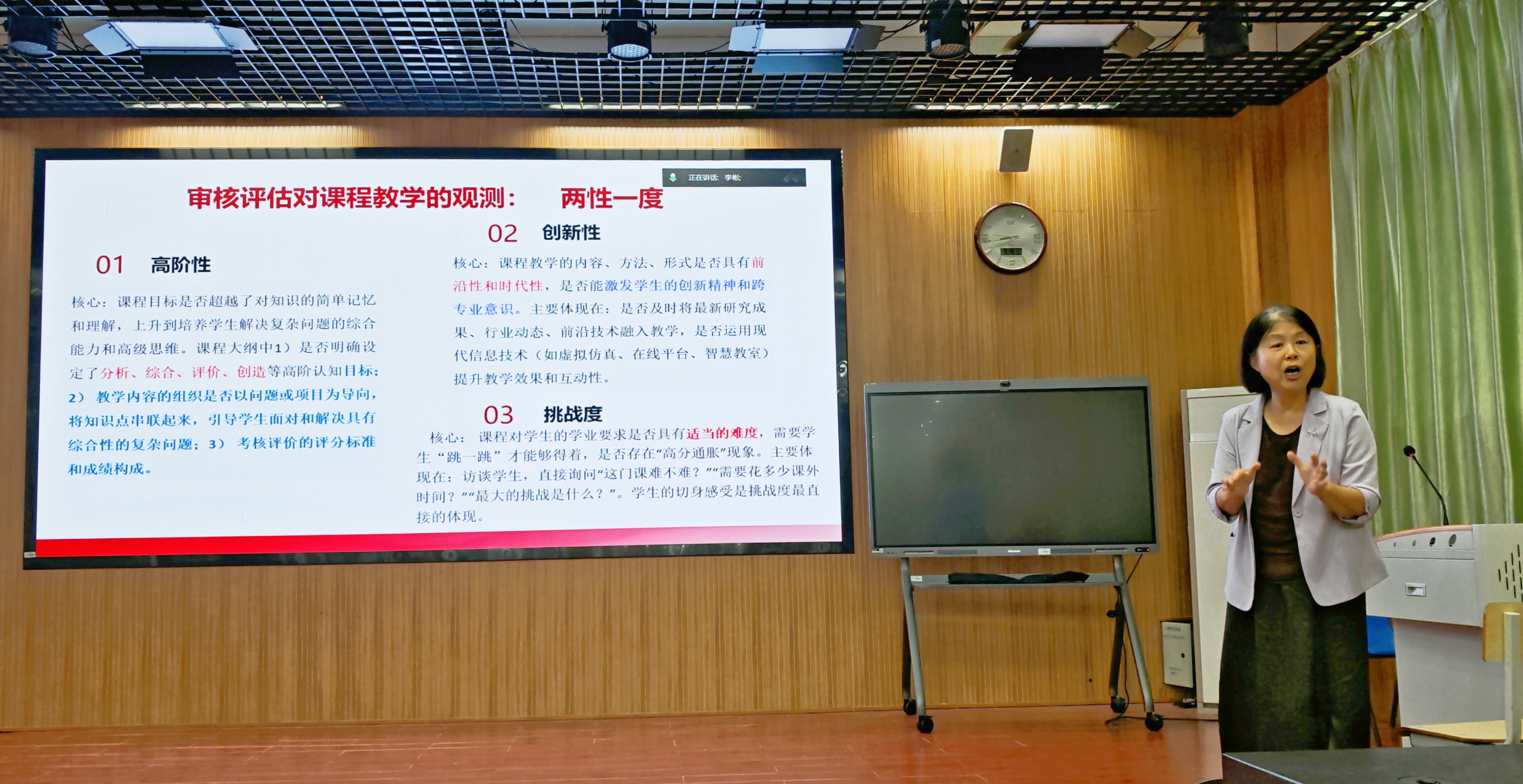 宋亚菲教授以“以评促建、以评促改、以评促管、以评促强”为题作专题讲座。她结合审核评估指标体系,重点解析了核心任务,总结了当前对分课堂教学中的存在问题,明确课程设计需以学生为中心,体现“知识-能力-素质”递进关系;针对部分教师“重形式轻内涵”问题,提出“讲授留白-独立内化-小组讨论-教师点评”四阶段优化方案,强调“学生主体性”与“教师引导力”的平衡。
